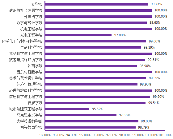 各院(部)的开课数、开课门次、班级数、教师数(人次)、学生数(人次)和学生上课率情况如下图所示: