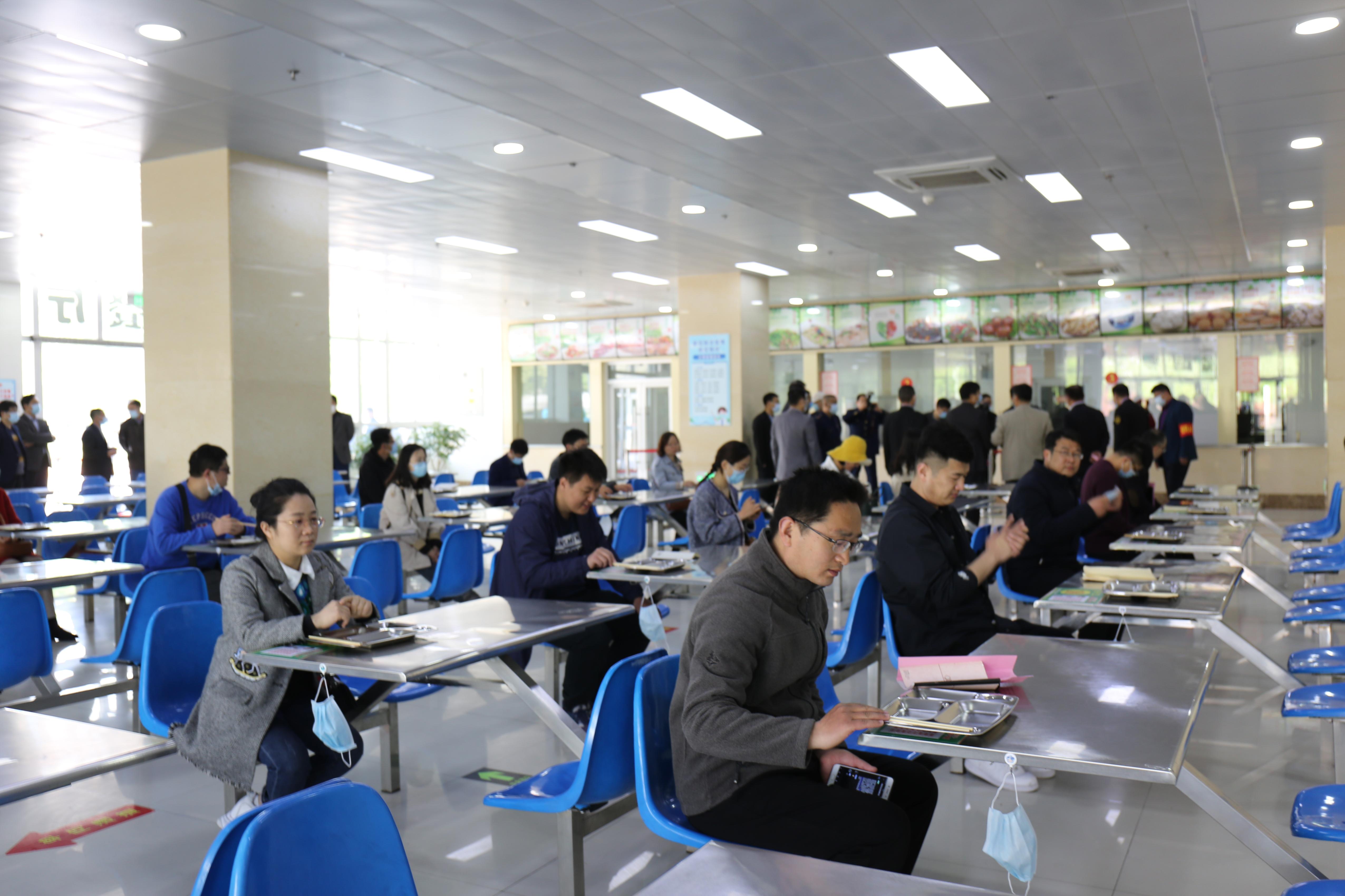 在“学生食堂错峰就餐应急演练”环节,三名体温监测员在门口分别负责测温、消毒工作,“学生”按照食堂门口“入口”指示进入食堂。在志愿者引导下,间隔两米有序排队打饭,“学生”取餐后单人单桌就餐。就餐完毕立刻按照食堂“出口”指示离开。志愿者现场监督提醒大家有序排队、少说话、不逗留。