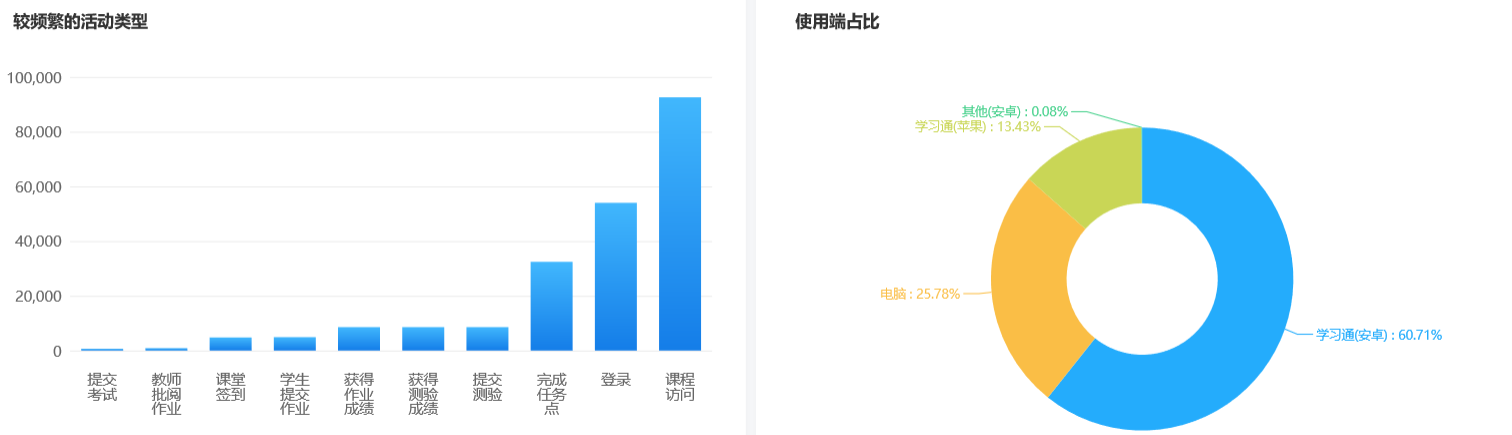 根据超星平台提供的大数据分析,可以查看本周课程打开次数、课程访问排行、较为频繁的活动类型、活跃度最高的院系和学习端口占比分别为: