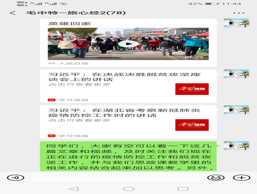4、在课外做好时政热点的助学者。在做好日常线上教学工作的同时,我还充分利用学习强国、人民日报公众号等平台资源,搜集国际国内的时政热点、党和国家领导人的重要讲话等重要文章或视频发送到专业微信群供学生学习使用,使学生能够实时了解时政动态,增强他们的理论素养,从而做到全方位育人。