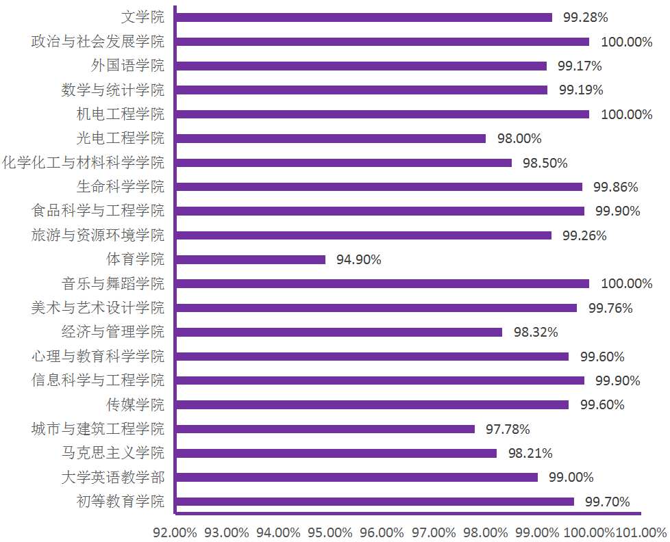 各院(部)的开课数、开课门次、班级数、教师数(人次)、学生数(人次)和学生上课率情况如下图所示: