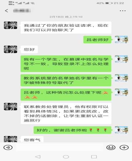 3、在课后做好学生学习的服务者。针对学生在日常自学或完成作业的过程中遇到的难以理解的问题提供全天候在线辅导,保持微信、电话随时在线,及时为学生解疑答惑,并针对慕课堂后台数据反馈出的在学习过程中存在某方面问题的学生进行一对一交流,切实做到全过程育人。