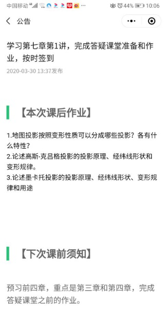 《地图学》是地理科学专业和地理信息科学专业的学科教育必修课程,重在培养学生科学认识地图的基本理论、掌握地图的现代制作方法以及正确运用地图的能力,学好该课程对于后期专业学习打下坚实的基础。由于该课程与数学、计算机科学关系密切,再加上疫情的影响使课程教学难度增大,为了更好的提高学生的学习效率,旅游与资源环境学院杜霞老师采取了“慕课优质资源+慕课堂+QQ群讨论+钉钉答疑课堂+效果监督”相结合的综合线上教学模式,并取得了一定的效果。