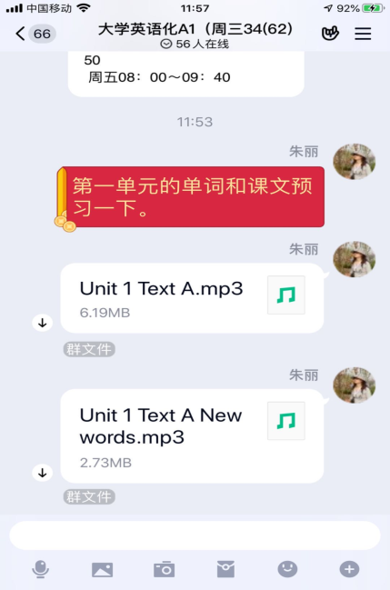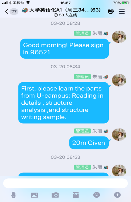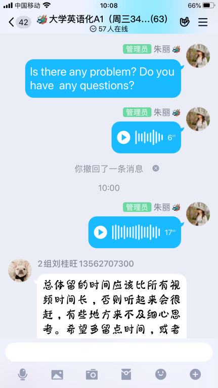 那么,“说”的问题如何在线上保证呢?课上,设置任务,对个别同学进行提问,让他们以发送语音的方式,检测他们听课的效率,并可以及时纠正发音。课下,布置说的练习,各小组在各自组群里进行实时话题讨论,以小组为单位进行录音并传送给老师,邀请个别组在一定时间和老师线上沟通答疑。