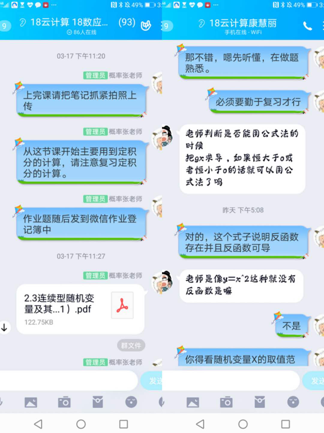 《概率统计》是18级数应本科1班、18级移动云计算本科1班的一门学科教育必修课。数学与统计学院张艳伟老师积极响应学校疫情期间开展 “停课不停学、停课不停教”的线上教学活动,认认真真地开展线上教学,确保班级学生线上学习学有所获、学有所成。在正式开展线上教学之前,将本课程的电子版教材发给每位学生,并且向学生推荐了参考书目。考虑到线上课堂的教学方式相对于线下有很大的区别,因此重新调整了教学进度。同时积极参加学校组织的各种线上教学平台使用的培训,并通过和学生反复测试,最终采用了雨课堂、屏幕录像专家、QQ视频分享屏幕功能、微信作业小程序相结合的教学模式。