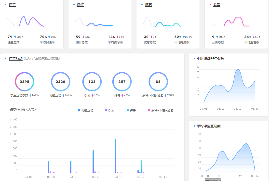 我校师生在雨课堂平台使用情况,根据大数据统计,由此查看本周开课数、发布公告数、课堂互动人次、平均课程互动数、试卷数、平均课堂PPT数,详情见下图: