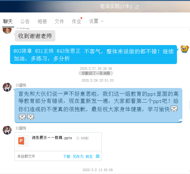 总之,《政务翻译》和《笔译实践》这两门课程的线上教学进展顺利,学生的参与度和自觉性都很高,绝大多数同学能够认真按照老师要求进行学习,积极完成作业,任课教师也将根据学习内容和学生反馈,不断改进教学方式,进一步提升线上教学效果。