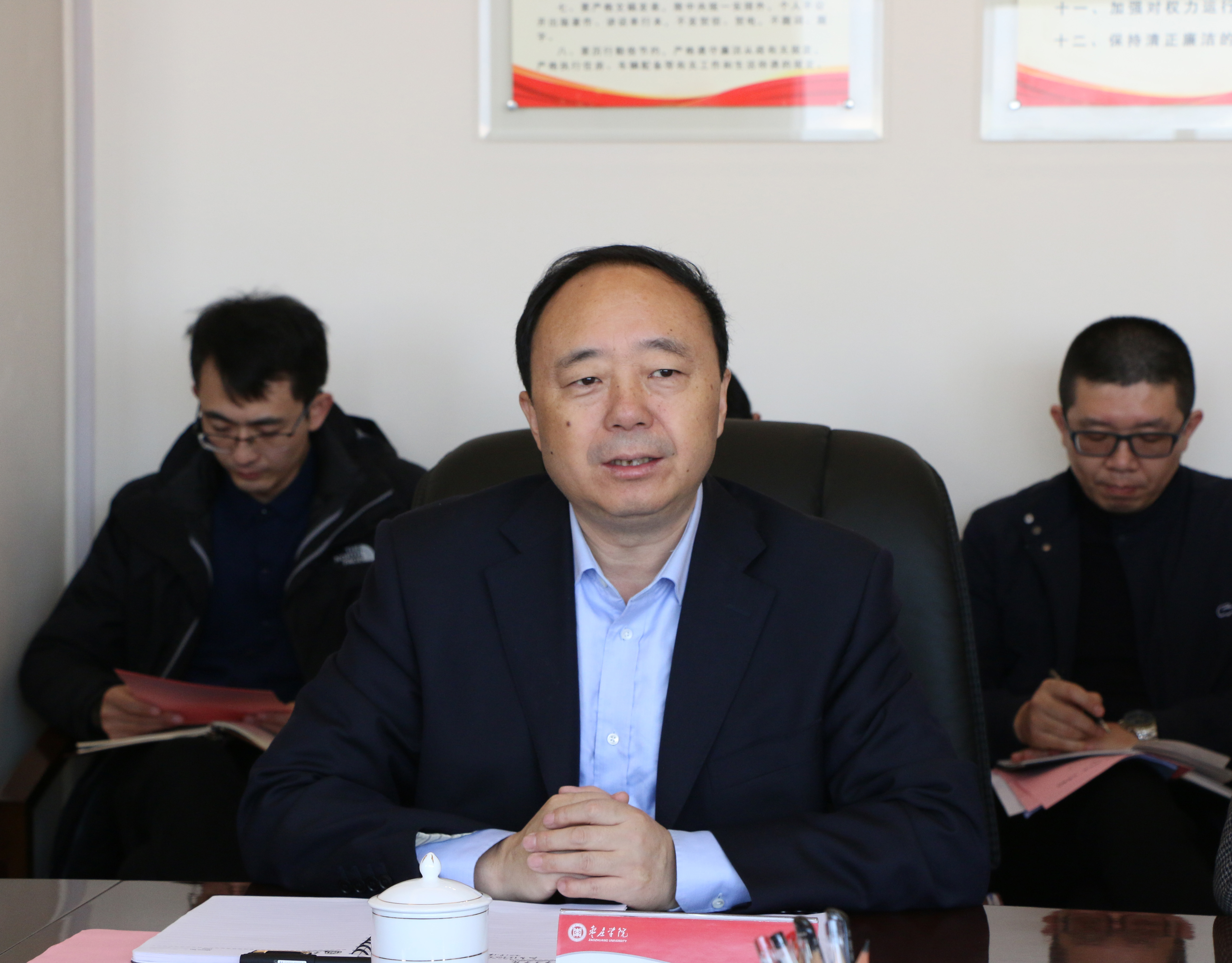 曹胜强对陶然一行来校调研表示热烈欢迎。曹胜强简要介绍了学校的办学历史、办学条件,并重点从以下五个方面介绍了学校的基本情况:一是人才培养方面。学校积极推进应用型大学转型发展,以产教融合、校企合作引领应用型人才培养模式改革,打造了引企入校的产教融合办学典范,形成了“123456”应用型人才培养模式,极大推进了学校的综合改革和人才培养。二是人才引进和科研方面。学校高度重视人才引进和学科建设工作,连续举办了两届博士论坛,大力引进、培养学术带头人和高层次人才,极大提升了师资队伍建设以及科研水平,高端人才集聚效应逐步显现。三是社会服务方面。学校在专业建设、人才培养等方面充分对接枣庄经济社会发展需求,创建特色学科,为地方提供多样化的人才需求,更好服务地方特色发展。四是国际合作方面。学校在国际化的发展趋势上,有学分互认、教师互派、友好合作学校等多种合作方式。目前重点在“一带一路”沿线国家招生,助力“一带一路”民心工程建设。五是文化传承方面。坐落在鲁班、墨子的故乡,学校充分发挥地缘优势,大力开展墨子鲁班文化的研究,特别是墨学研究在全国享有一定知名度。学校通过各种方式打造匠心文化品牌,并于今年举办了首届新时代中国卓越匠心文化论坛,切实做好文化传承和创新。