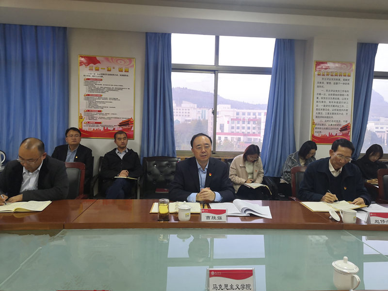 按照帮包联系单位安排,11月11日,校党委书记曹胜强到马克思主义学院指导“不忘初心、牢记使命”主题教育与党建工作。学校主题教育第一巡回指导组全体同志、马克思主义学院党政班子及教师党员代表参加会议。曹胜强强调,马克思主义学院党员干部、教师要将“不忘初心、牢记使命”主题教育学习内容入脑入心入魂,将学习成果转化为立德树人的动力;要全面系统学、深入思考学、联系实际学,发挥好学习贯彻落实习近平新时代中国特色社会主义思想的带头作用;要抓好党组织自身建设,打造过硬党支部,加强业务和党建的“双带头人”工作;要找准定位和发力点,把主题教育与马克思主义学院立德树人的根本任务结合起来,全面提升思政育人能力和水平。
