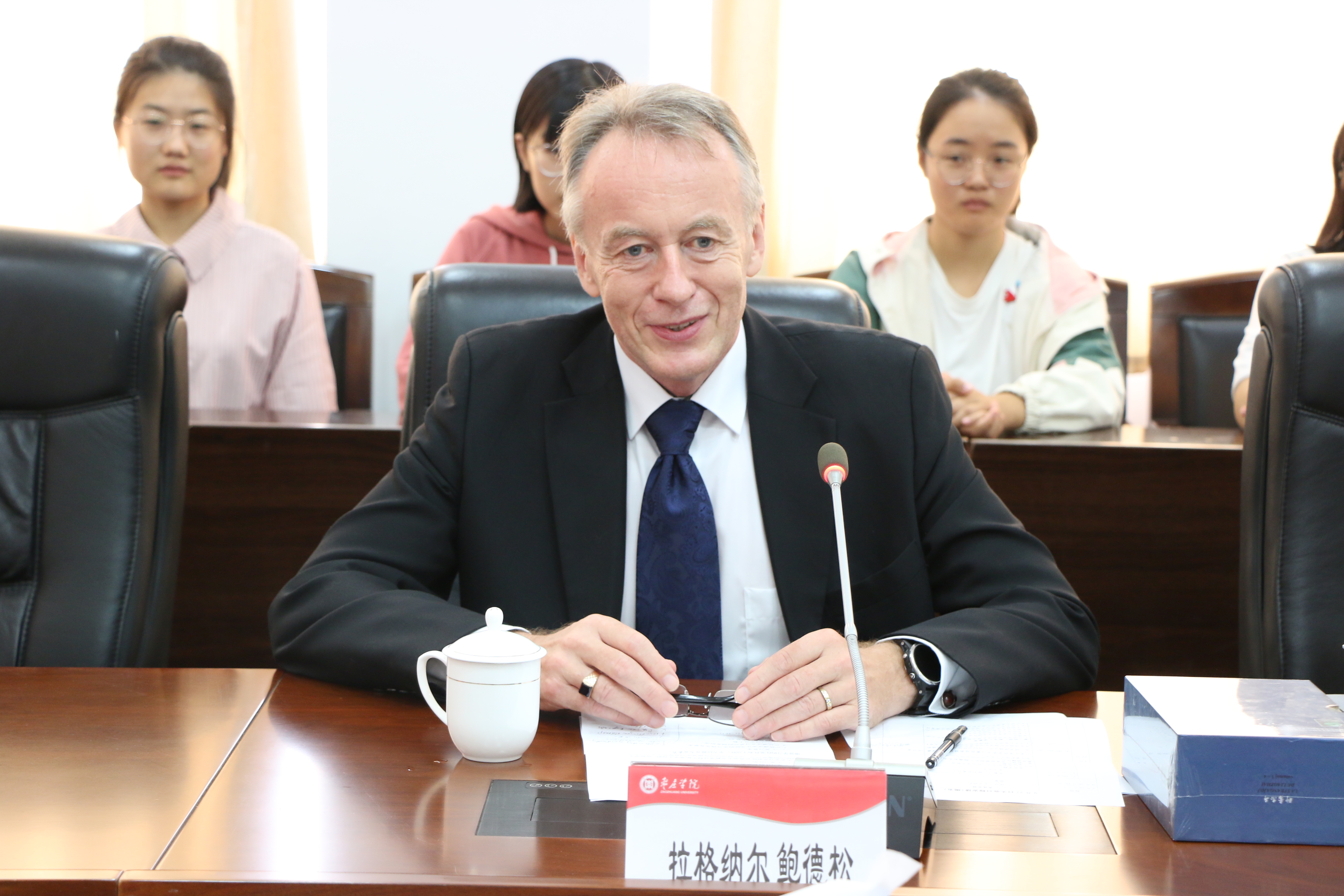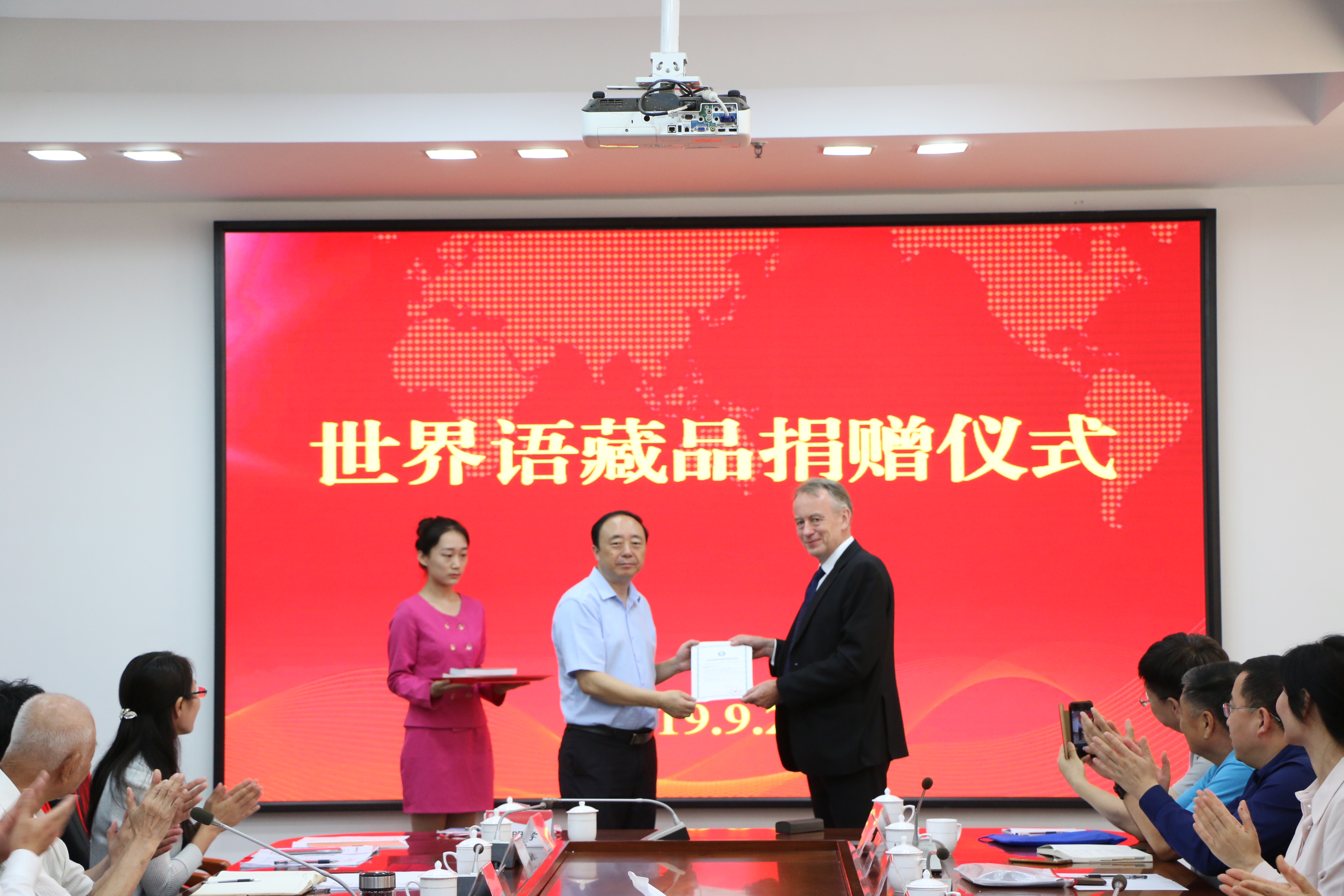 学校党委书记曹胜强接受了拉格纳尔·鲍德松先生向学校世界语博物馆捐赠的藏品,为其颁发捐赠证书并向拉格纳尔·鲍德松先生赠送我校编译的世界语全译本《聊斋志异》。