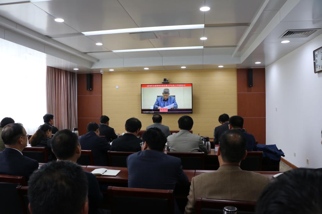2019年全省教育系统全面从严治党工作视频会议的主要任务是深入学习习近平新时代中国特色社会主义思想和党的十九大精神,贯彻落实全国教育系统全面从严治党工作视频会议精神,总结2018年全面从严治党工作,部署2019年工作任务。省委教育工委常务副书记,省教育厅厅长、党组书记邓云锋出席并讲话,省委教育工委委员,厅党组成员、省纪委省监委驻省教育厅纪检监察组组长杨洁德传达了有关会议精神。省委教育工委副书记,省教育厅副厅长、党组副书记黄琦主持会议。