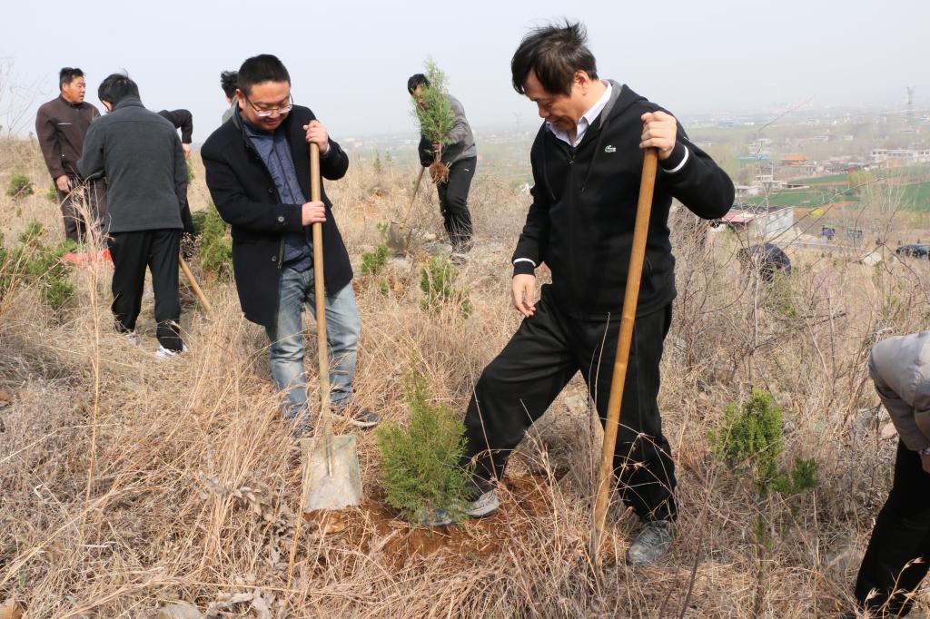 植树点一片繁忙,参加植树的领导和同志有的奋力挥锹填土,有的俯身为树苗浇水,有的边干边相互讨论植树造林、改善生态环境的看法。经过一番热火朝天的劳动,50余棵新栽种的树苗迎风挺立,把植树点的山头装点得更加生机盎然。