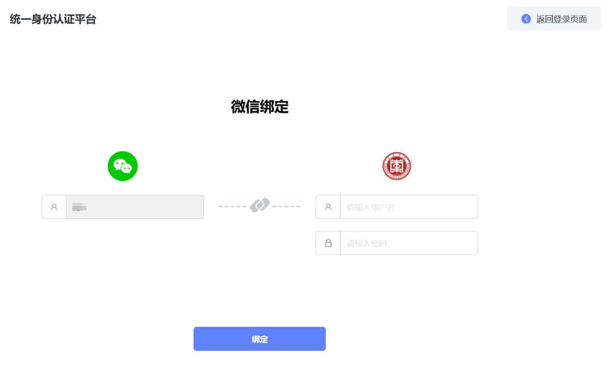 微信扫码登录,首次登录需将微信账号与统一身份认证账号进行绑定(如下图所示),用户名为个人六位工号,密码为身份证后六位(最后一位是X的要大写)。绑定之后重新设定新密码,以后就可以直接扫码登录了。