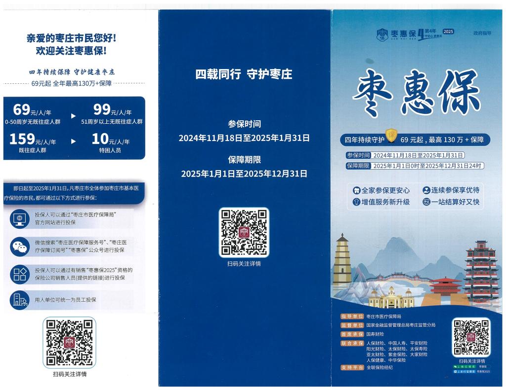 • 参保对象:枣庄市基本医疗保险在保人员(包括城镇职工和城乡居民),不限年龄、性别、职业、健康状况,无论是否患病均可均可参保。