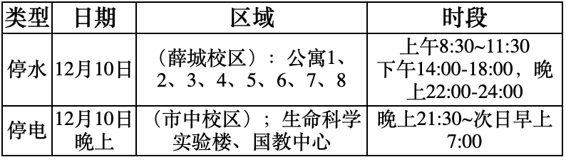 为提升水电管理水平,学校计划为市中校区和薛城校区安装智能水电表。目前该项目已完成招标、采购,现进入安装阶段。为将停水停电对教育教学、办公等活动的影响降到最低限度施工将分区域分时段进行。从11月28日起,后勤服务处将每天公布当日停水停电的具体区域和时段。请涉及的相关单位做好准备,提前通知到每位教职工,确保人员和设备安全,例如服务器、计算机、实验设备等做好备份,电梯和其它特种设备做好提前应对和管理。当日停水停电具体区域详见附件(每日更新,提前1天发布)。特殊情况联系电话15866247658。