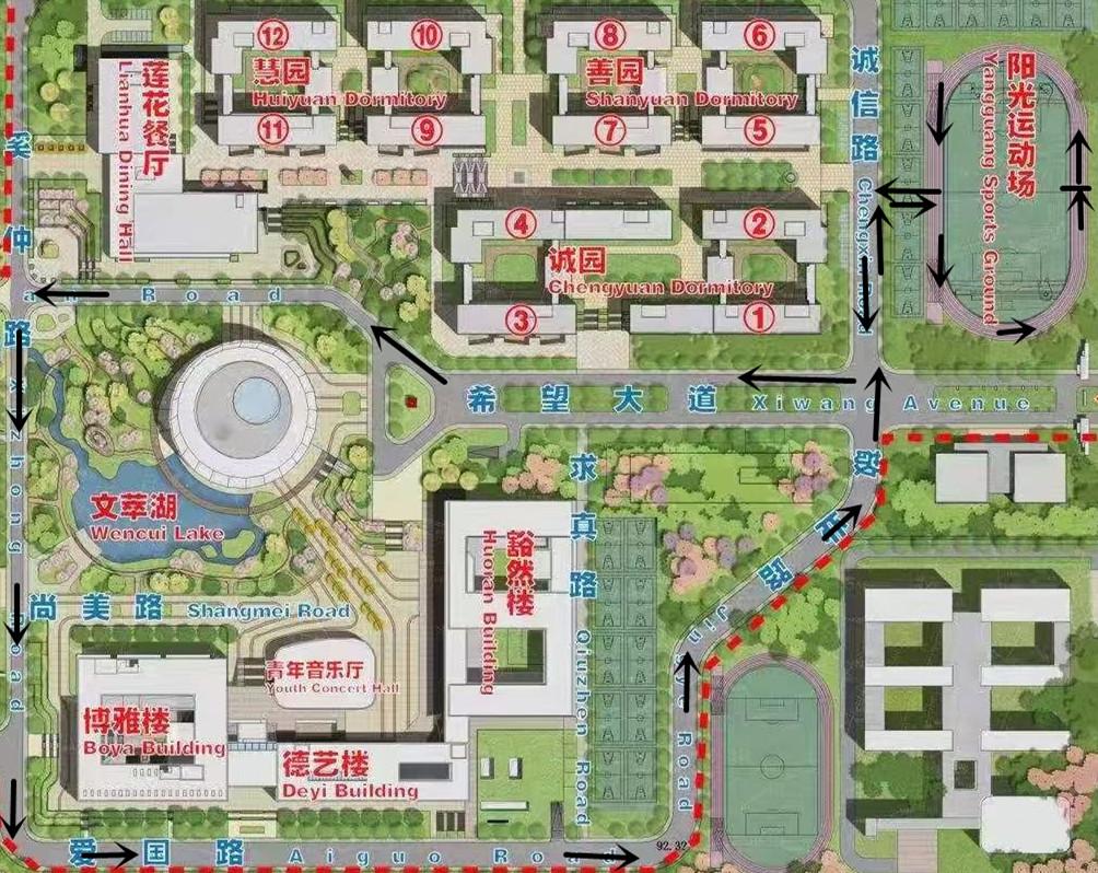 薛城校区:阳光运动场主席台前出发→绕田径场半圈西门出→左转进入校道→右转进入希望大道→莲花餐厅门口左转进入奚仲路→博雅楼左转进入爱国路→进入敬业路→敬业路→左转进入希望大道→莲花餐厅门口左转进入奚仲路→博雅楼左转进入爱国路→进入敬业路→敬业路→诚信路→阳光运动场西门→绕跑道半圈→终点主席台前。