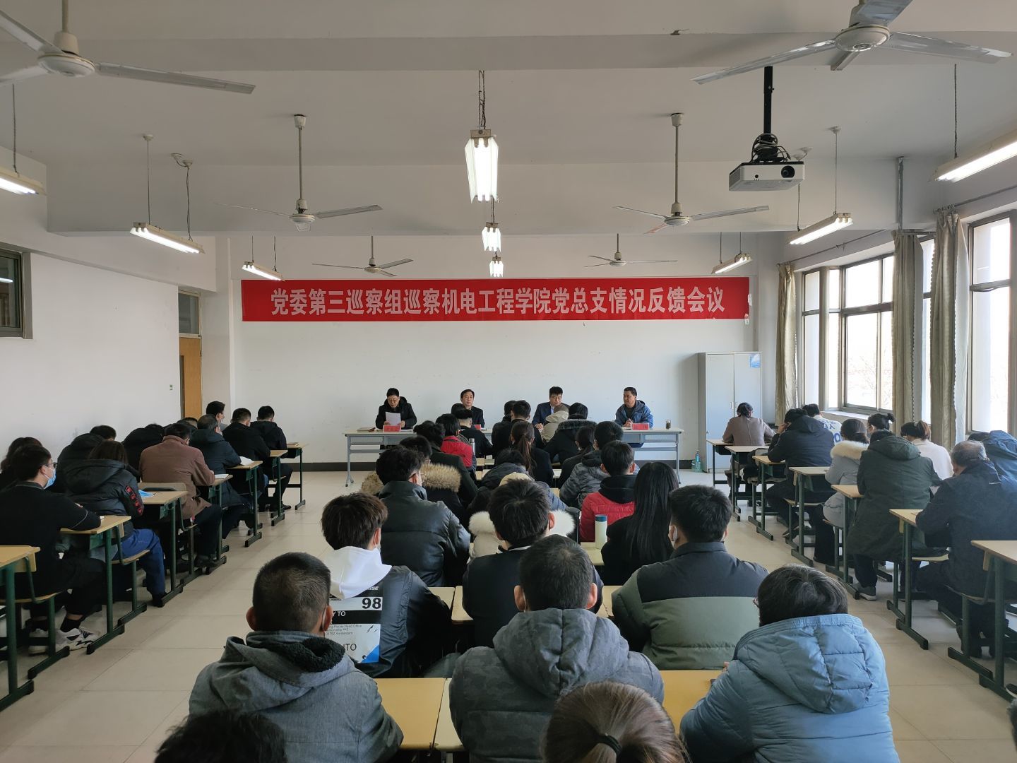 3月3日下午,党委第三巡察组在理工楼2420室召开了巡察机电工程学院党总支情况反馈会。党委巡察工作领导小组成员、纪委副书记、正处级监察员石少华同志,党委第三巡察组副组长汪涛同志,学院党政领导班子成员及全体教职工、学生党员代表参加会议。会议由院党总支书记徐春堂同志主持。