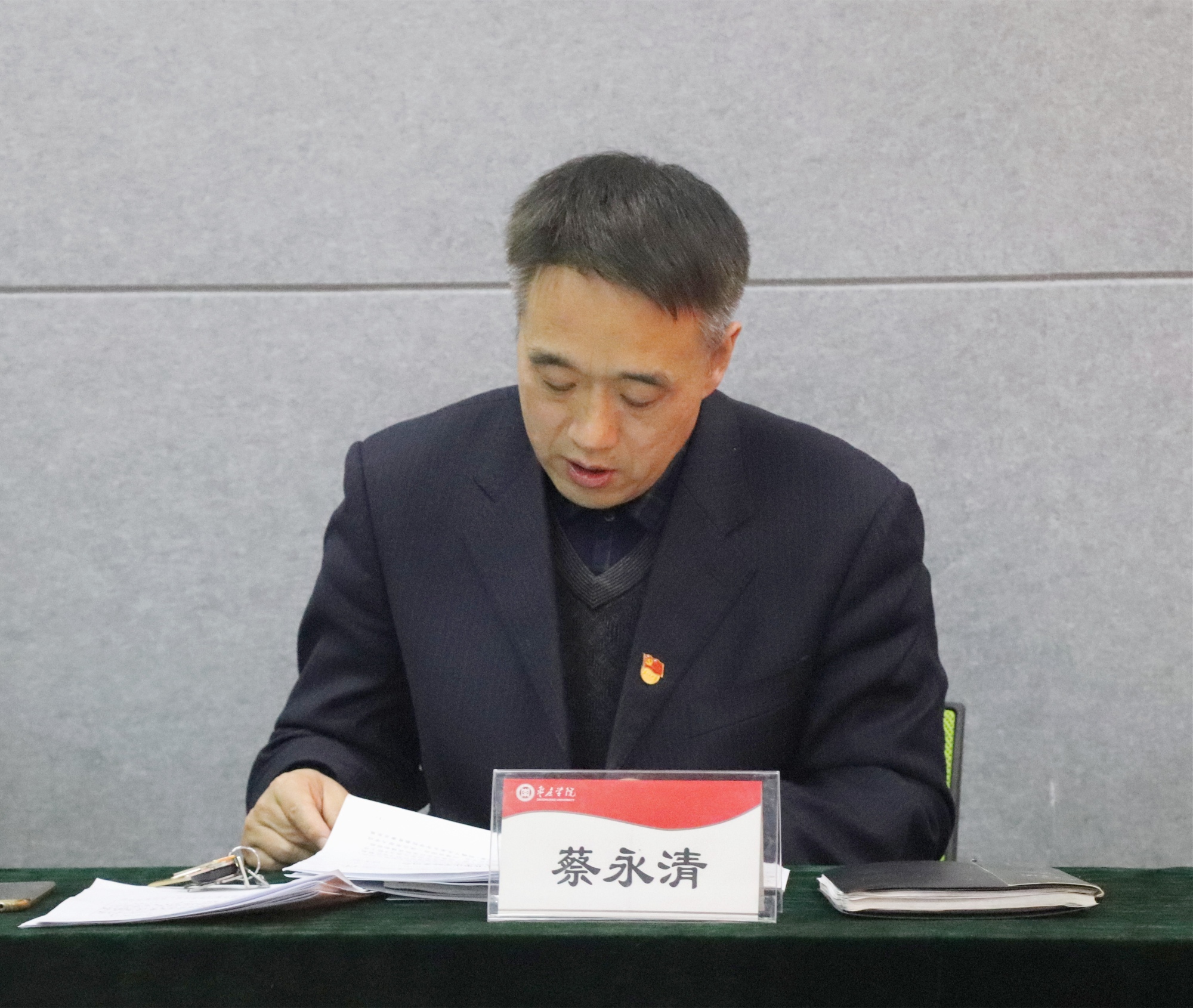 蔡永清首先全文领学了第三次党代会题为《站在新起点 迈向新征程 为建成国内一流应用型大学而努力奋斗》的工作报告,逐一梳理了二次党代会以来的成绩和经验、明确问题和不足,详细解读了学校“三步走”的奋斗目标和五大发展战略,就如何发挥党建引领和保障作用结合学院存在的实际问题进行了分析说明。