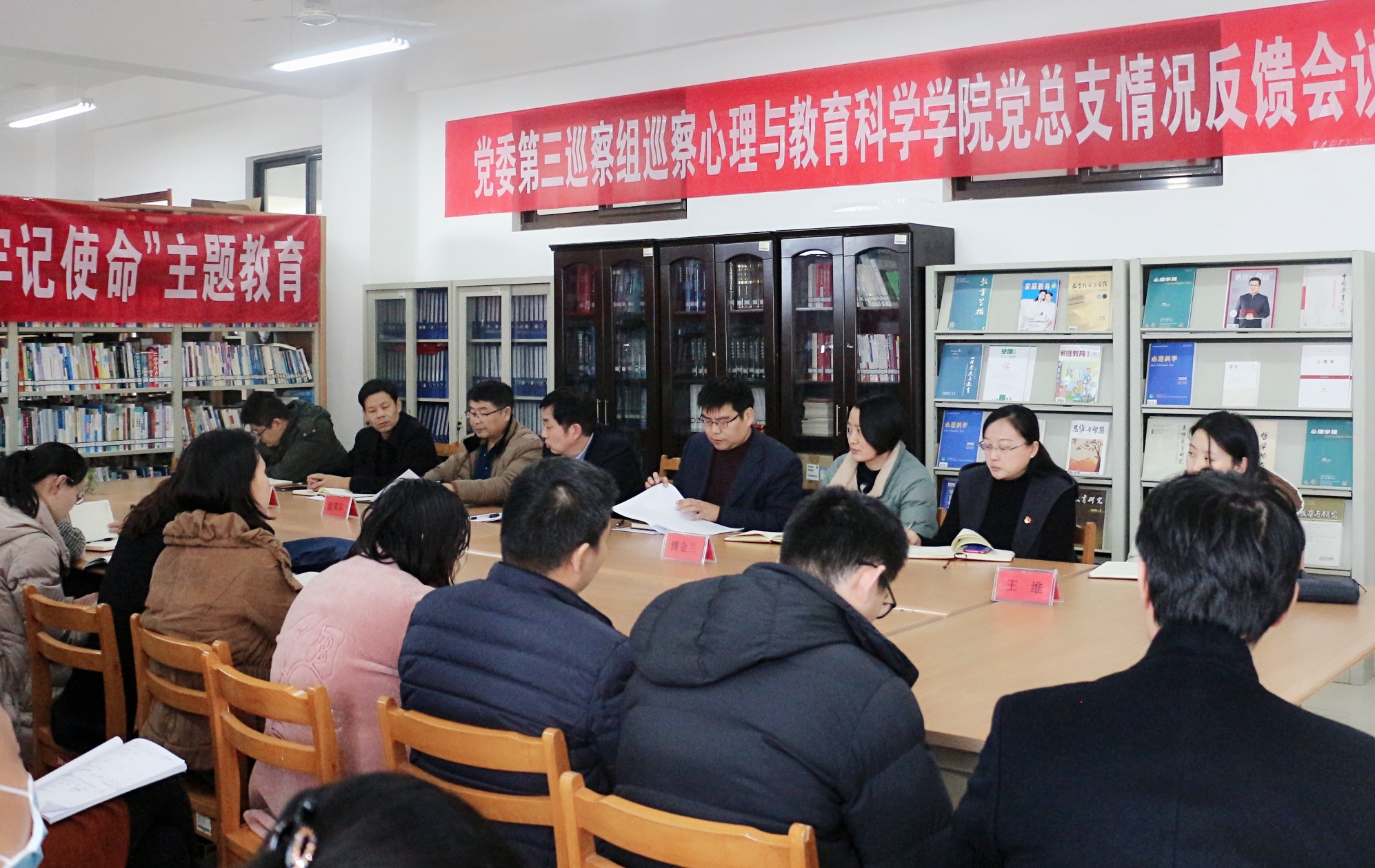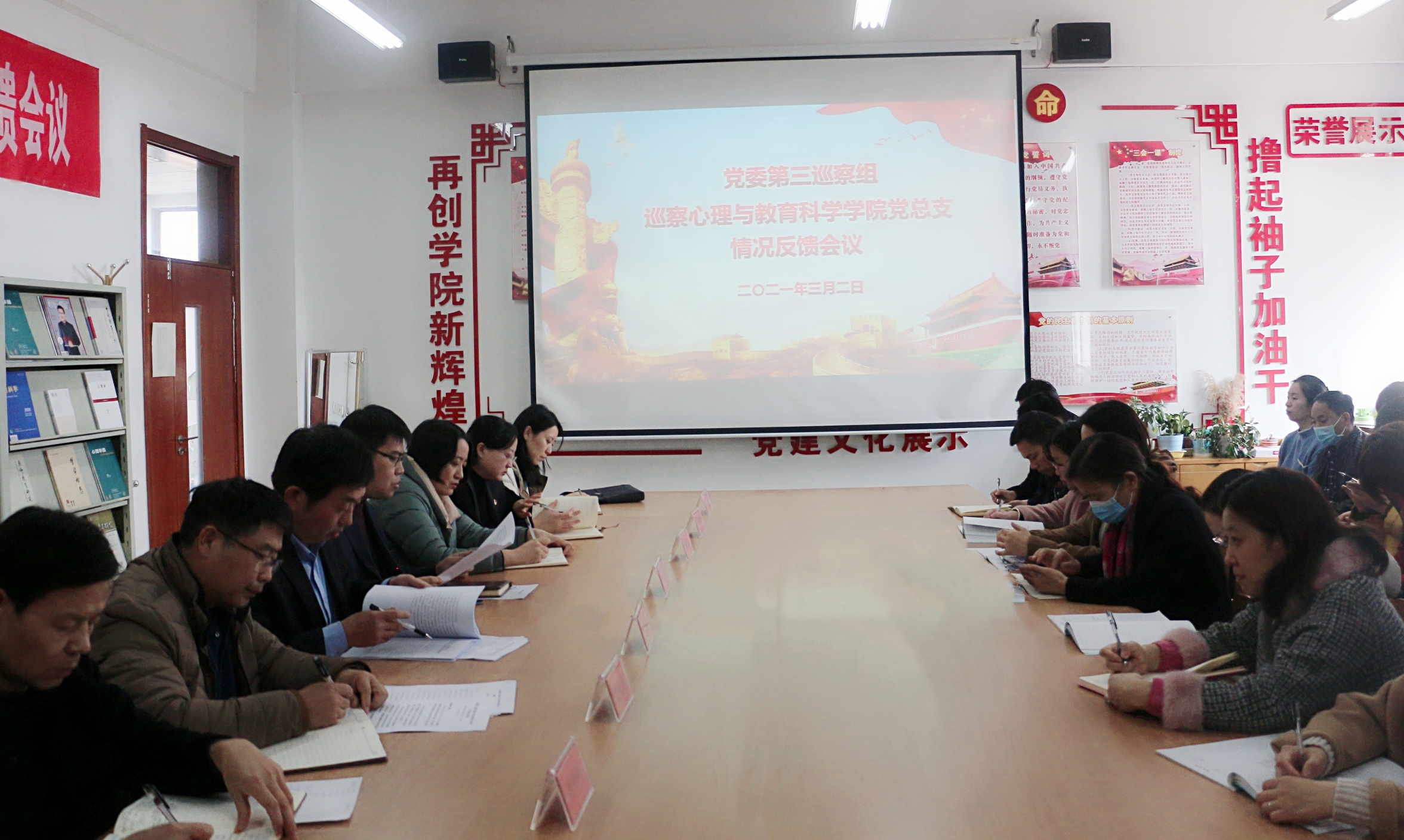 3月2日下午,校党委第三巡察组在教师教育楼15-215室召开了巡察心理与教育科学学院情况反馈会议。校纪委副书记、正处级监察员、校党委巡察工作领导小组成员石少华和校党委第三巡察组副组长汪涛等同志出席会议。学院党政领导班子成员及全体教职工、学生党员代表参加会议。会议由学院党总支书记赵荣军同志主持。