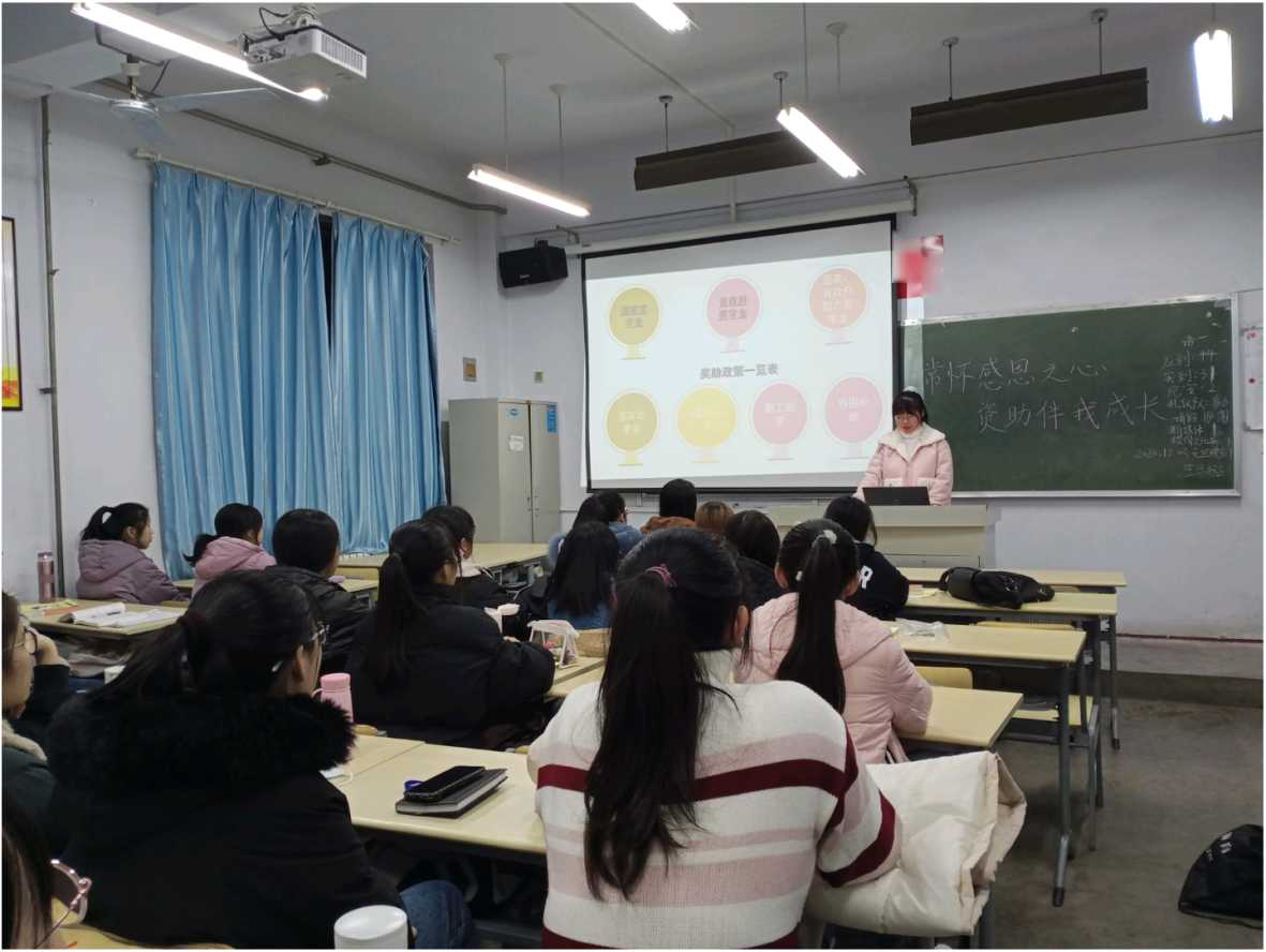 此次主题教育活动主要包括资助政策宣讲主题班会、感恩励志征文、“文学院资助宣传大使”和“文学院十大励志榜样”评选等内容。上一届资助宣传大使和励志榜样借助资助政策宣传课件和身边的实例为各班级同学详细介绍了国家奖助学金、国家助学贷款、建档立卡等资助政策的具体内容、申请标准和评选程序等内容,与同学们交流心得体会,为同学们解疑答惑。