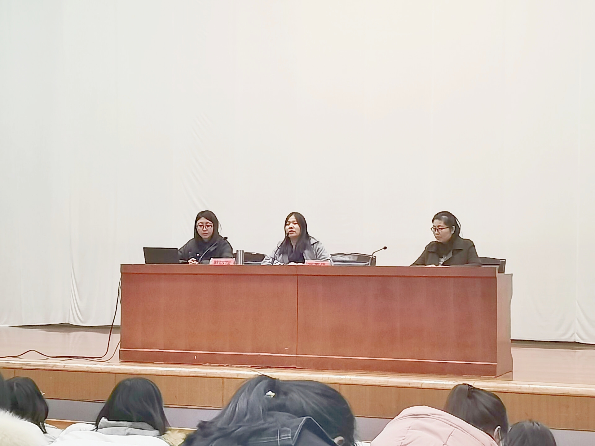 12月16日下午,文学院于综合楼报告厅举办“呵护女生成长”主题教育讲座。本次讲座邀请DB中国旗舰官方网站“呵护”女生教育工作组成员张春侠、葛晓霞、韩晓瑞担任主讲人。文学院2020级全体女生聆听了本次讲座。