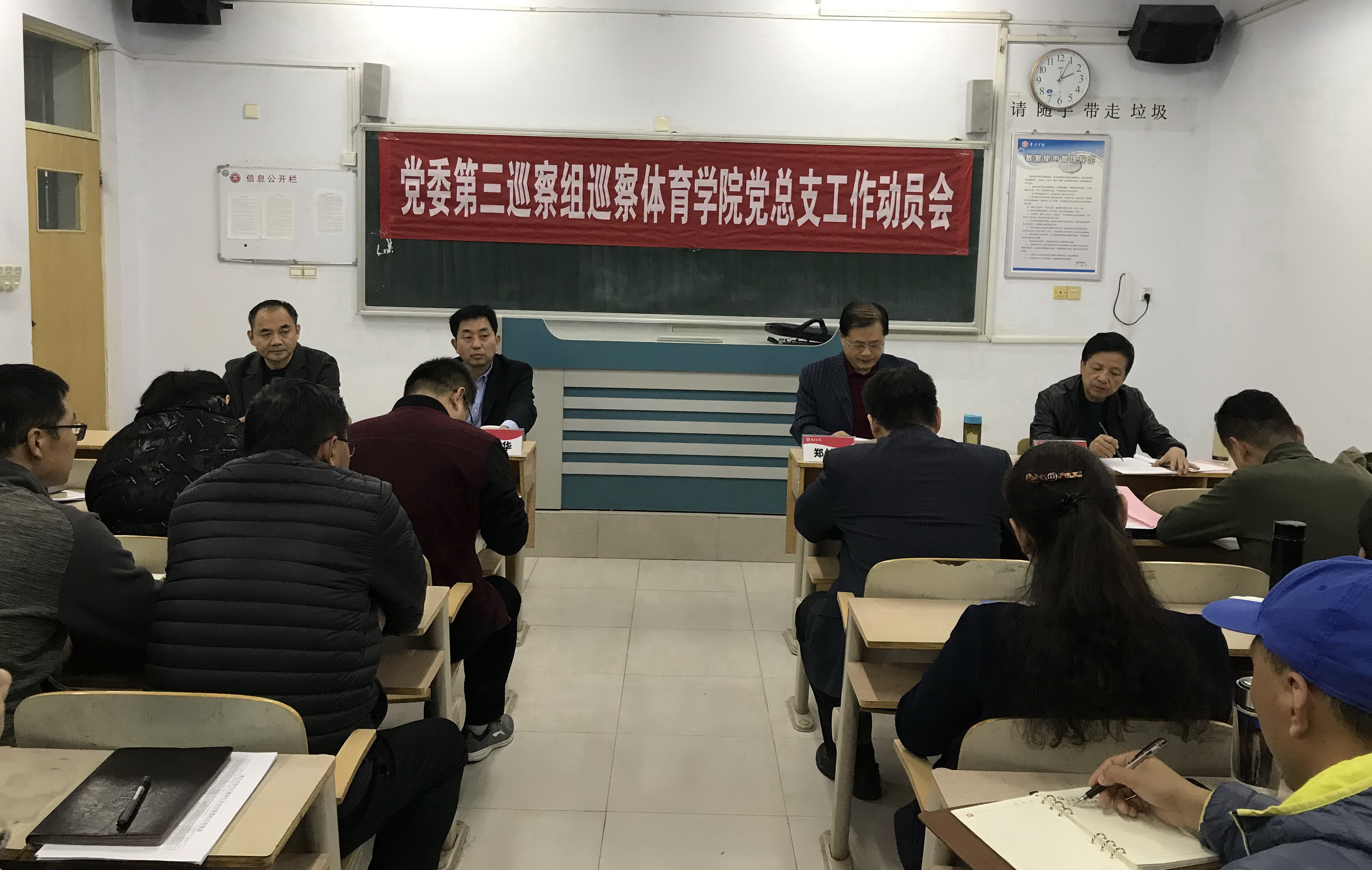 11月25日下午,党委第三巡察组巡察体育学院党总支工作动员会在体育楼6102室召开。党委巡察工作领导小组成员、纪委副书记、正处级监察员石少华代表学校讲话,党委第三巡察组组长郑付海对巡察工作进行动员部署,体育学院党总支书记孟祥卫主持会议并作表态发言。党委第三巡察组全体成员,体育学院领导班子成员、全体教职工、学生党员共50余人参加会议。