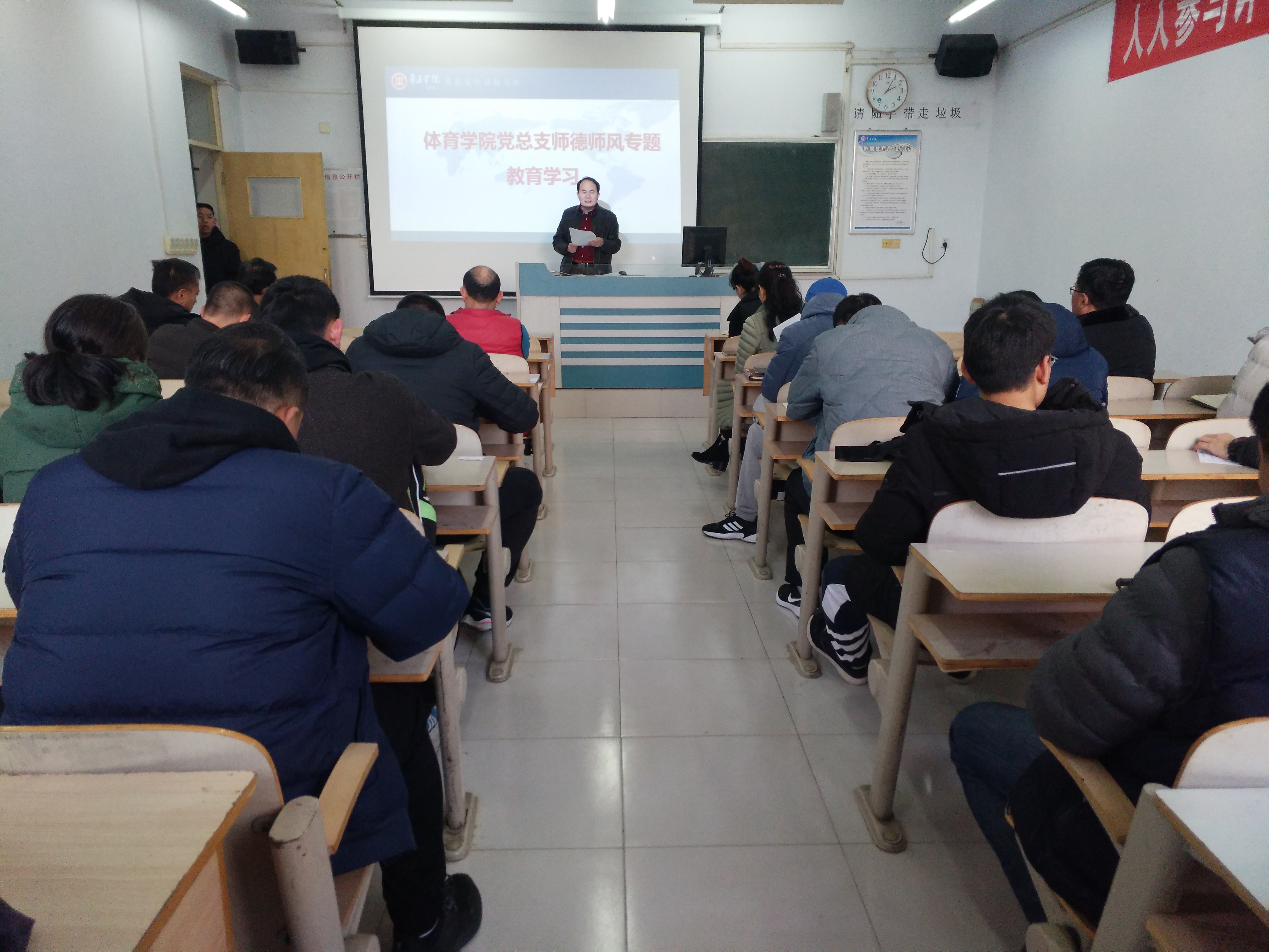 12月18日下午,体育学院在体育楼102教室举行师德师风、廉洁从教专题教育大会,体育学院党政领导、全体教师参加了会议,会议由宋建修书记主持。