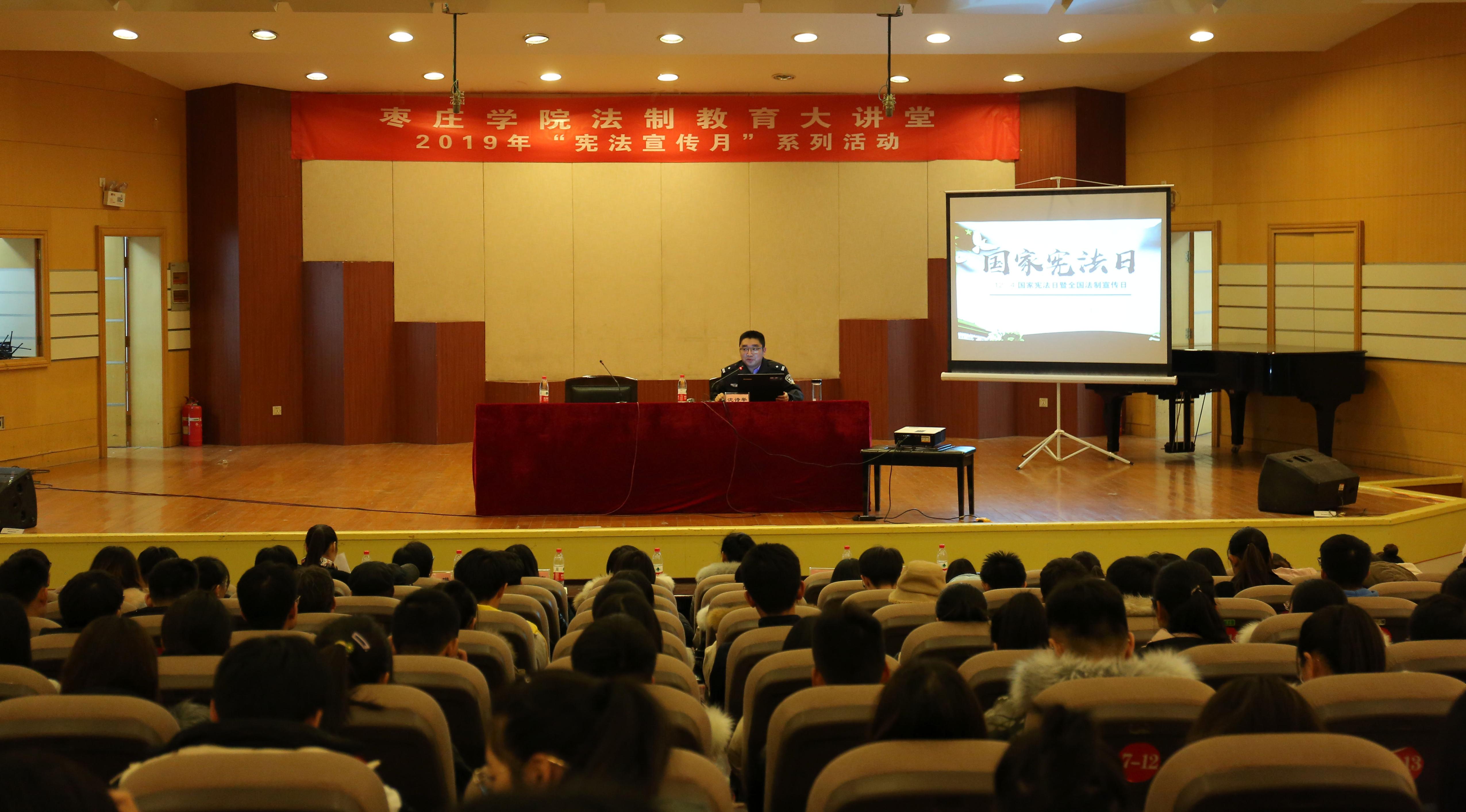12月11日下午,枣庄市公安局法制支队副支队长沈诗举应邀走进DB中国旗舰官方网站法制教育大讲台,在音乐楼报告厅为我校师生做“宪法宣传日”主题宣传讲座。我校部分教师代表、各学院学生代表近三百人共同聆听宣讲报告。