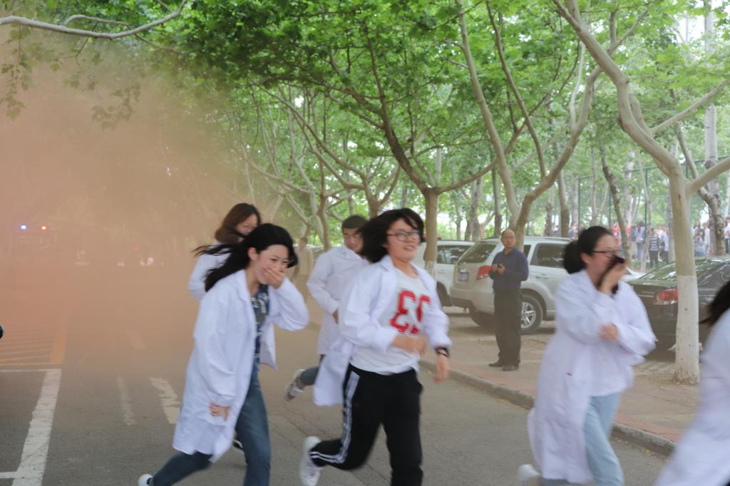 本次演练以2018级学生为主。模拟实验楼某部位发生火情情景,燃放烟幕弹,该房间顿时浓烟滚滚,很快漫延到整个楼层。按照预案,工作人员迅速拉响消防报警器,通过消防广播通知室内人员关闭电源、用湿毛巾捂住口鼻向楼外疏散,同时向校园“119”报警。在工作人员有条不紊地组织疏散下,楼内“遇险”人员很快被引领到安全地带。学校110指挥中心迅速反映、默契配合,校园微型消防站队员及时赶往现场救援。