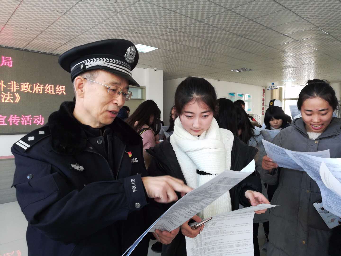公安干警现场向参加活动的每一位师生发放宣传材料,对法律条款进行了详细的解读。