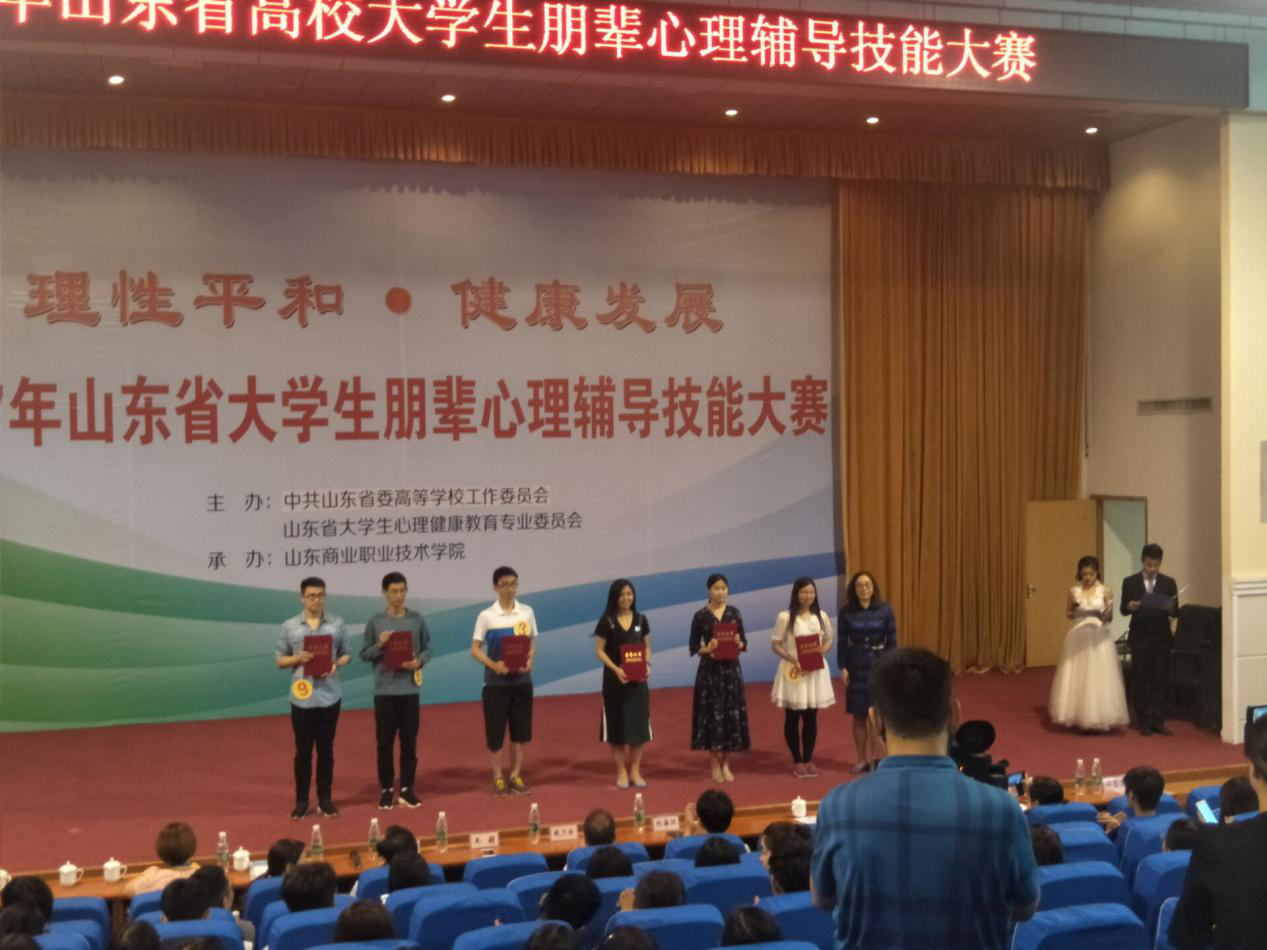 5月31日,在2017年山东省大学生朋辈心理辅导技能大赛中,我校心理与教育科学学院学生郁琪、邱茹、徐文娇组成的代表团荣获一等奖。2017年山东省大学生朋辈心理辅导技能大赛是2017年山东高校大学生心理健康节的一项独立的活动,是由中共山东省委高等学校工作委员会和山东省大学生心理健康教育专业委员会联合主办、山东商业职业技术学院承办的,共有来自全省本专科院校的106支代表队参加。