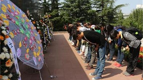 上午十点,主持人宣布烈士公祭仪式正式开始,师生齐唱国歌;国歌唱毕,全场肃立默哀。