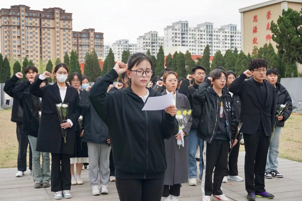 陵园庄严肃穆,烈士纪念碑高耸入云,全体同学神态庄严,心怀敬仰,饱含着对革命烈士的哀思,大家肃立默哀,向那些为国家、为人民英勇献身的先烈们致以最崇高的敬意。马克思主义学院学生代表王一博、信息科学与工程学院学生代表丁佳琦进行发言,鼓励同学们继承和发扬先烈的光荣传统和优秀品质,争做中华民族传统美德的传承者,努力学习、奋发向前,为祖国的繁荣富强贡献自己的力量。纪念碑前,全体共青团员高举右拳,重温入团誓词,用铿锵有力的声音展现枣院学子砥砺拼搏的进取精神,立志为实现中华民族伟大复兴而努力奋斗的信心和决心。