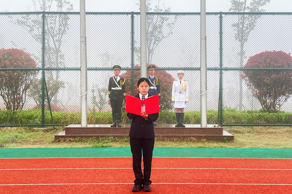 升旗仪式在雄壮的国歌声中拉开帷幕,伴随着国旗护卫队铿锵有力的步伐,五星红旗冉冉升起,迎风飘扬,全体师生庄严肃立,面向国旗行注目礼。