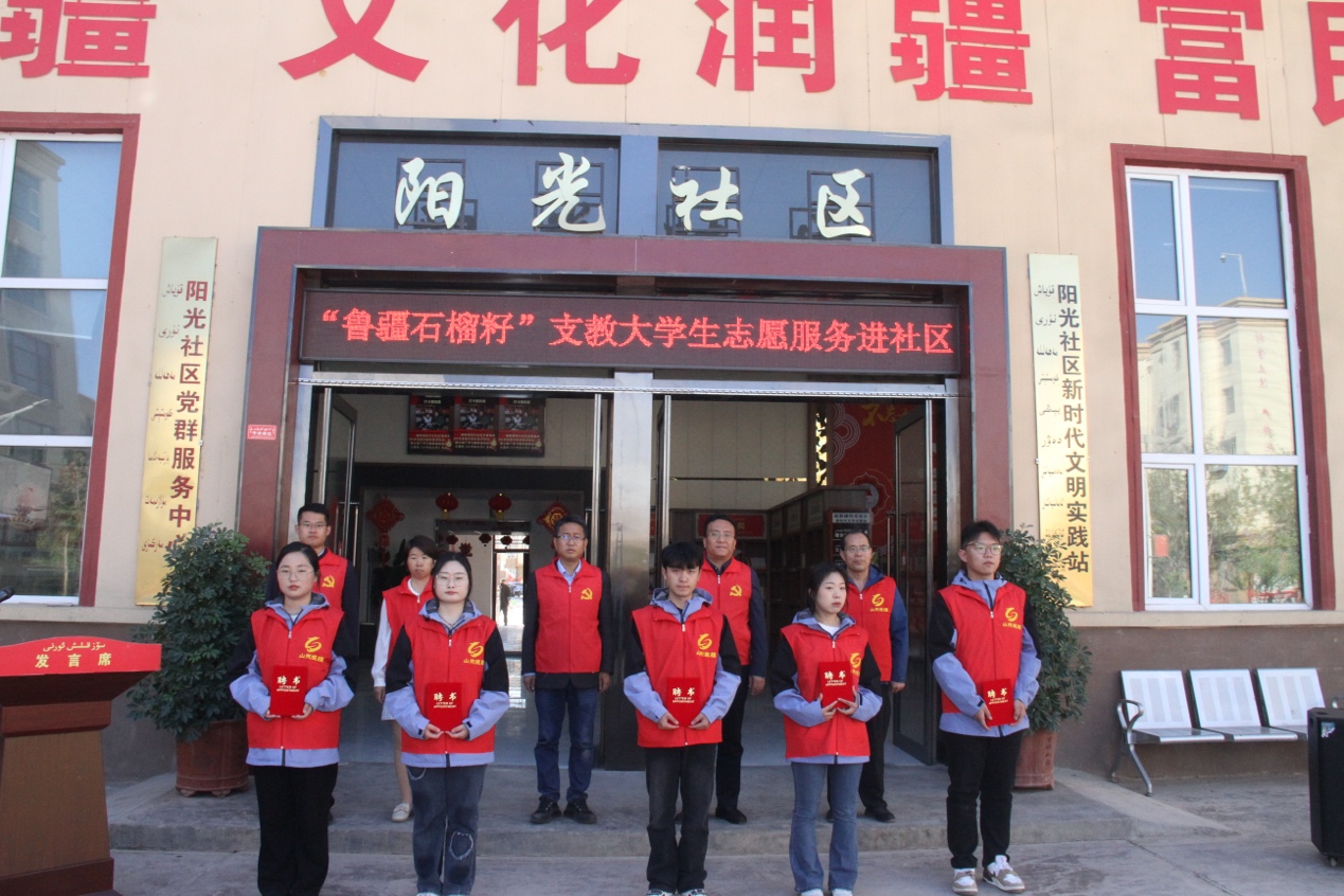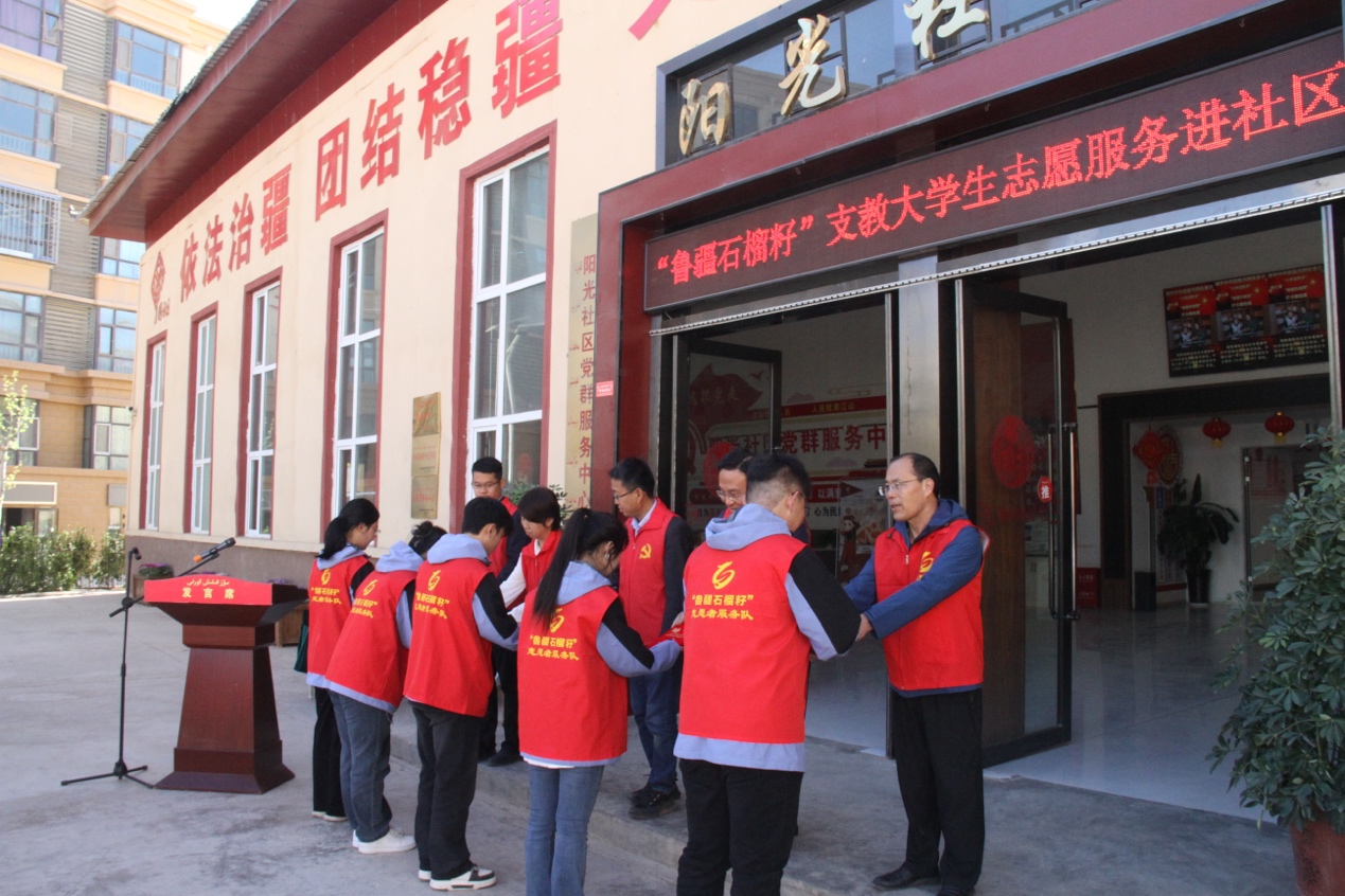 4月17日上午,“鲁疆石榴籽”支教大学生志愿服务进社区活动在疏勒县阳光社区启动。东营援疆指挥部、疏勒县相关部门领导,疏勒镇分管领导及相关社区党组织书记,我校援疆支教团带队教师及首批24名志愿者参加启动仪式。