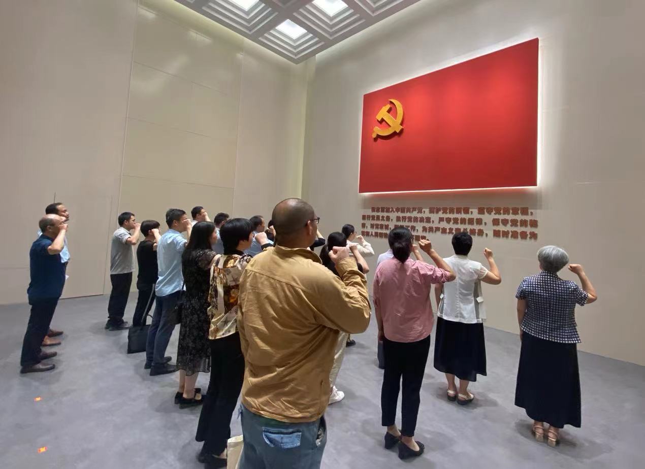 在廉政教育馆内,党员们跟随着讲解员的引导,依次参观了纪律教育、警示教育、廉洁文化3个专题展厅,深入学习了党在不同时期加强自身建设的历程,特别是党的十八大以来全面从严治党取得的卓著成效以及“清廉枣庄”廉洁文化品牌建设亮点特色,观看了近年来枣庄市查处的违纪违法案例、忏悔书、家书等警示教育视频。通过“沉浸式”党纪学习教育,使广大党员,尤其是党员干部进一步知敬畏、存戒惧、守底线。在参观学习尾声,党员重温入党誓词,面向党旗庄严宣誓,感悟初心使命。