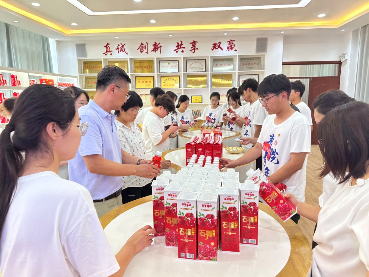 7月15日,实践团走进薛城区榴姿石榴美妆生产基地、山东多子多福生物科技有限公司、石榴·蓝莓零碳数字产业园等企业参观考察农业数字经济与乡村振兴的深度融合实践。实践团学生们从浩大的展厅走到大棚、走进车间,感受数字技术的应用对产业的智能化水平的提升,对农业产业链的优化和升级的促进,体验了了以“绿色低碳”为引擎、带动更多产业实现绿色低碳转型的实践案例。