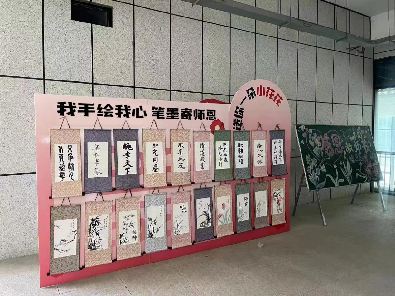 展览以感恩师恩、尊师重教为主题,共展出书法作品十件,国画作品十件。学生们运用精湛的笔墨技巧和独特的构思,充分发挥自己的想象力,以书言志、以画寄情,充分展现了对老师们的深深敬意和感激之情。无论是国画的细腻笔触,软笔书法的流畅线条,还是黑板报的丰富内容,每一笔每一划都充满了对老师崇高的敬意和真挚的祝福。