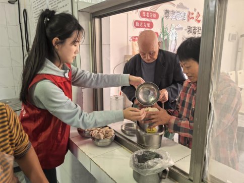 在社区,志愿者帮助清扫卫生,和老人们拉家常,向爱心食堂献上慰问品,帮助社区工作人员包水饺。对于行动不变的老人,志愿者将打包好的水饺、饭菜送到老人家中,并送上重阳节的浓情问候和关怀祝福。