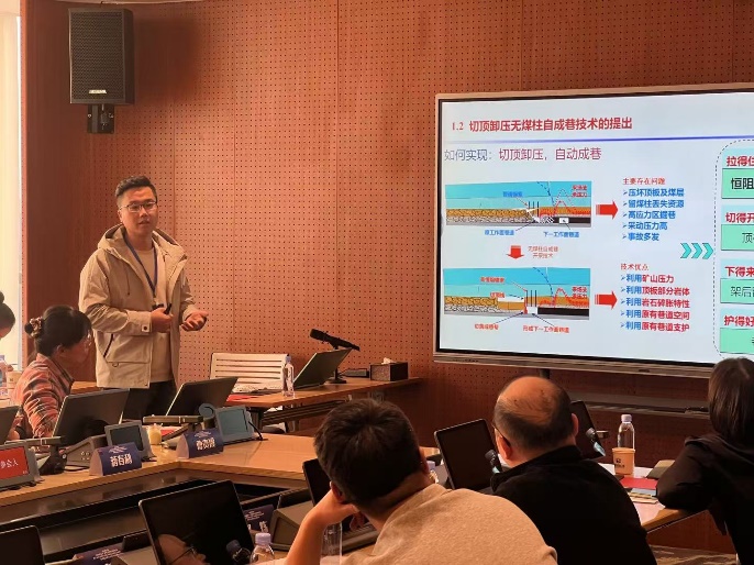 挑战杯“揭榜挂帅”特等奖指导老师王昊昊在论坛上作了题为《无煤柱自成巷上覆岩层运移与矿压、地表岩移监测规律》的报告,详细介绍了无煤柱自成巷技术的原理、工艺流程及其在矿山压力调控、上覆岩层结构优化和地表沉陷控制等方面的应用成果,并同与会代表进行了深入交流。