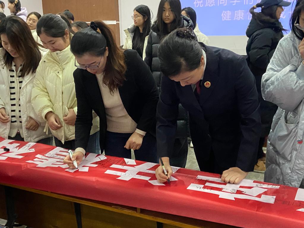 报告中,张维丽向同学们介绍了检察院和未成年人检察的职能,从刷单的“馅饼”or“陷阱”、直播间里打赏的背后、警惕娱乐场所的黑手、女生的安全自护教育、正确的恋爱观等方面,结合发生在学生身边的真实案例,以案释法,深入浅出地帮助同学们学会分辨与预防侵害,引导青春期女生了解宪法,弘扬宪法精神,维护宪法权威,了解法律知识,学会在实际生活中运用法律武器保护自己,真正做到知法、学法、守法、用法。活动最后,师生与检察官一起在“大力弘扬宪法精神 用法治守护未来”宣传横幅上签下了自己的名字,签名是对宪法的承诺、对宪法的坚定信仰。