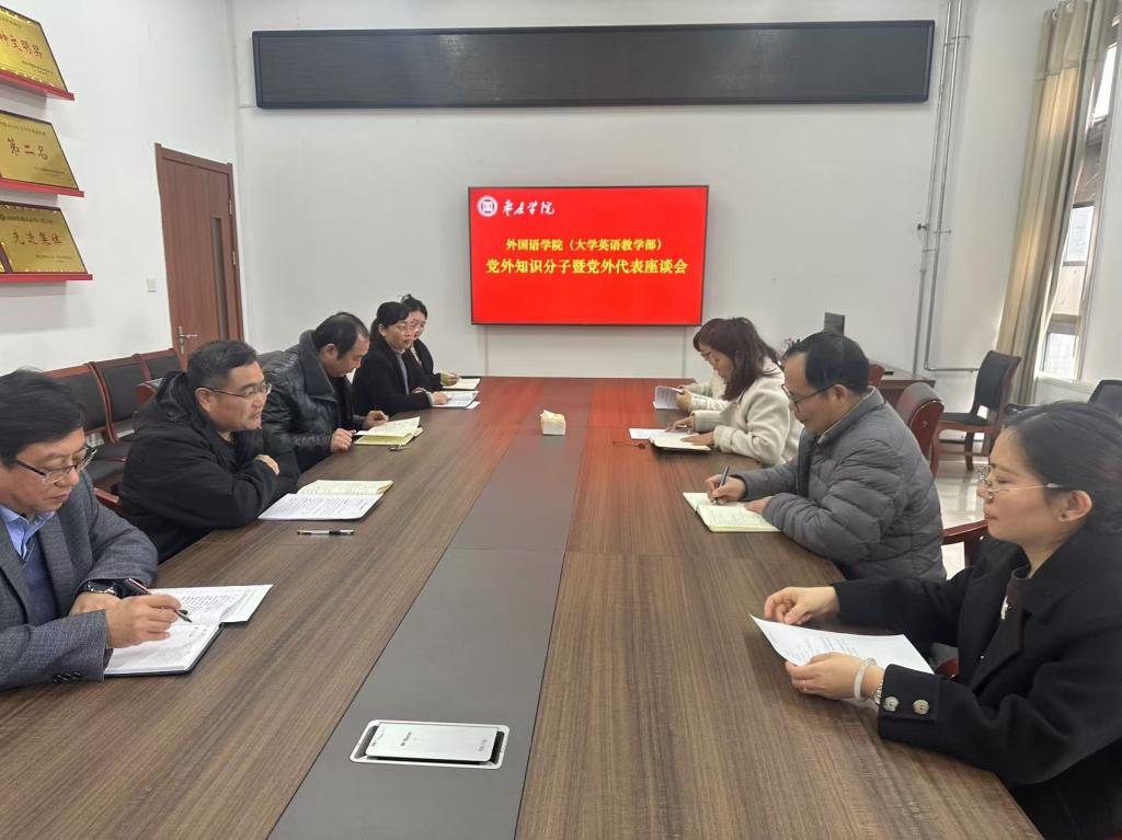 为进一步凝聚共识,铸牢共同思想基础,12月9日,外国语学院(大学英语教学部)在豁然楼A102会议室召开党外知识分子暨党外代表座谈会。学院党政领导及党外知识分子代表参加座谈。