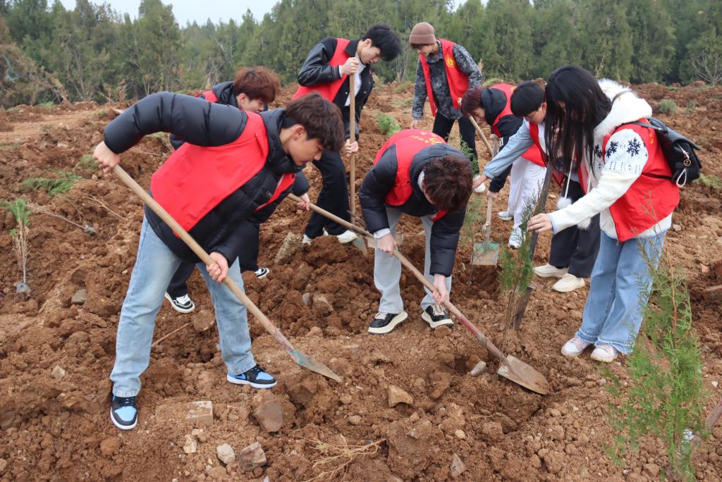志愿者们身着整齐的志愿者服饰,以饱满的热情投入到植树活动中,在带队教师的悉心指导下,志愿者们分工明确、配合默契。有的同学挥动铁锹,奋力铲土;有的同学则小心翼翼地扶起树苗,确保其笔直挺立;还有的同学专注于填坑,将泥土轻轻覆盖在树苗根部,每一个动作都一丝不苟。志愿者们以实际行动诠释着“奉献、友爱、互助、进步” 的志愿服务精神,用辛勤的劳动践行着可持续发展的理念。