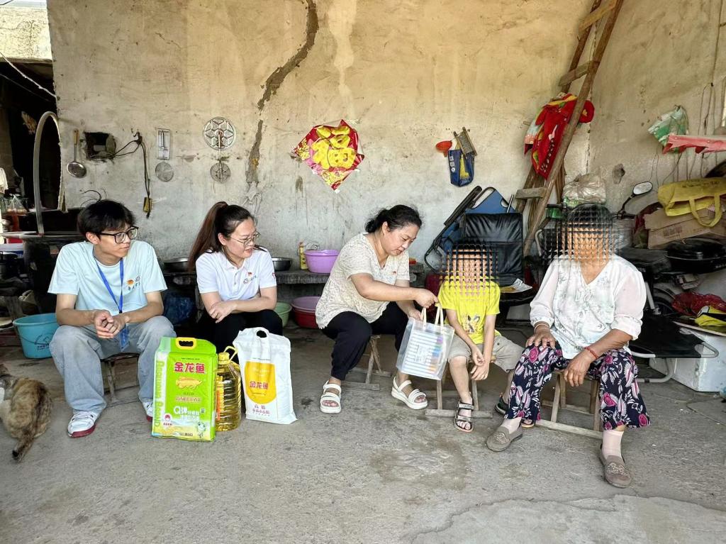 针对乡村留守儿童情感陪伴缺失、成长资源不足的现状,团队成员看望村里的留守儿童,并构建“短期送暖+长期结对”帮扶体系。开展谈心谈话,倾听童声,走进童心,了解所需;赠送学习用品,油、米、面等生活必需品。同时,组织团队成员与留守儿童开展“一对一”结对帮扶,将关爱从“一次关怀”延伸为“日常陪伴”,助力乡村儿童身心成长,为乡村振兴注入情感动能。
