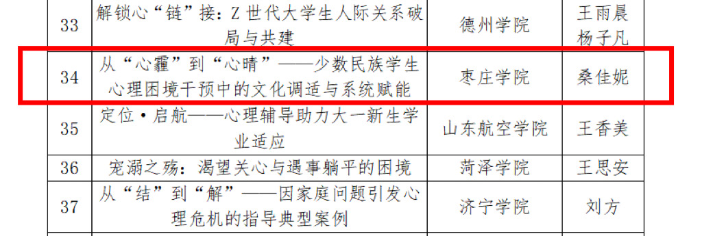 本次评选由山东省教育厅等四部门联合组织开展,旨在总结推广学生心理健康教育优秀做法与典型经验,提升全省高校心理育人实效。经单位推荐、专家评审、公示等环节,最终评选出一批具有代表性、创新性和推广价值的优秀案例。桑佳妮的案例聚焦少数民族学生心理适应问题,通过文化调适与系统赋能相结合的方式,有效帮助学生走出心理困境,展现了扎实的专业素养和深厚的育人情怀。