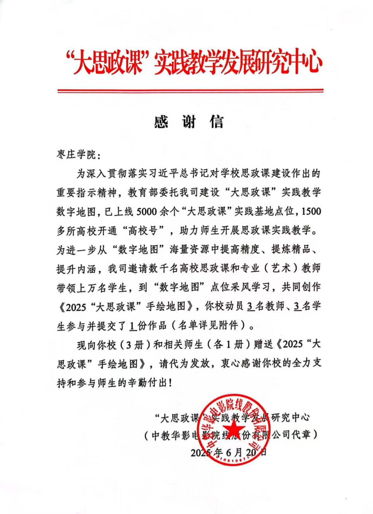 近日,“大思政课”实践教学发展研究中心向我校发来感谢信,对我校在“大思政课”实践教学数字地图建设和《2025“大思政课”手绘地图》创作中的参与师生表达感谢。
