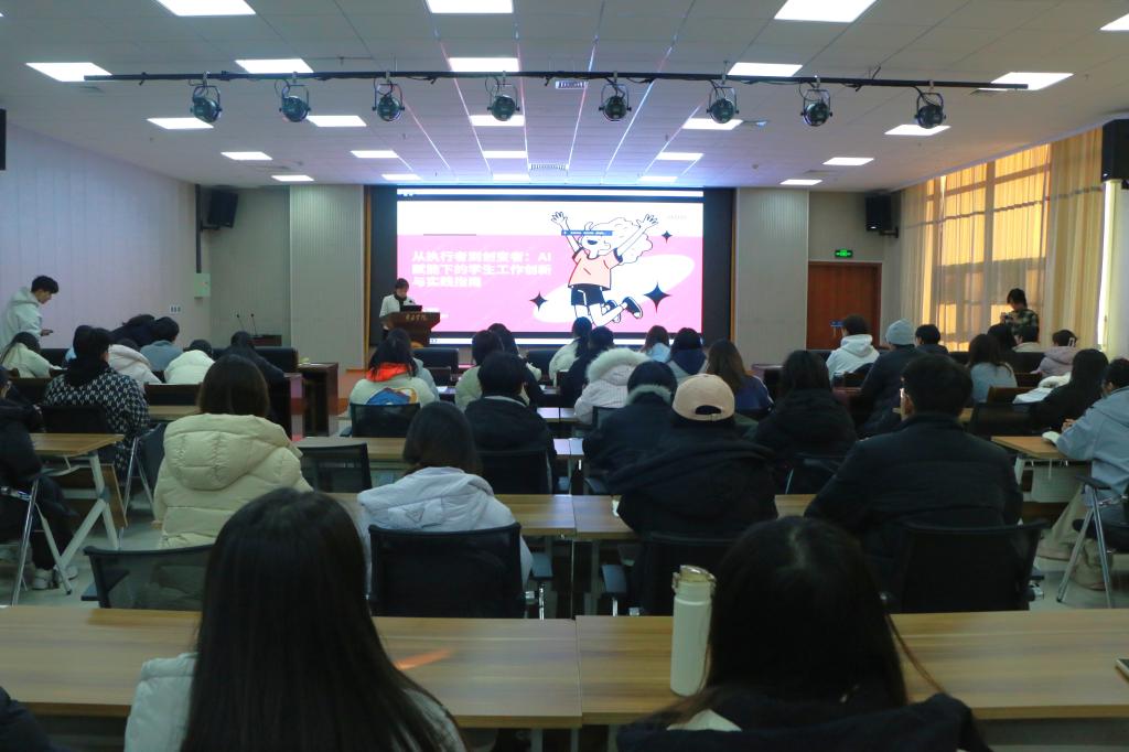 1月7日下午,我校在薛城校区明理楼113举办班墨大讲堂之“从执行者到创变者:AI赋能下的学生工作创新与实践指南”专题报告会,培训邀请教育数字化领域教师石斯瑾主讲,全体青马学员以及团属学生组织学生干部300余人参加。