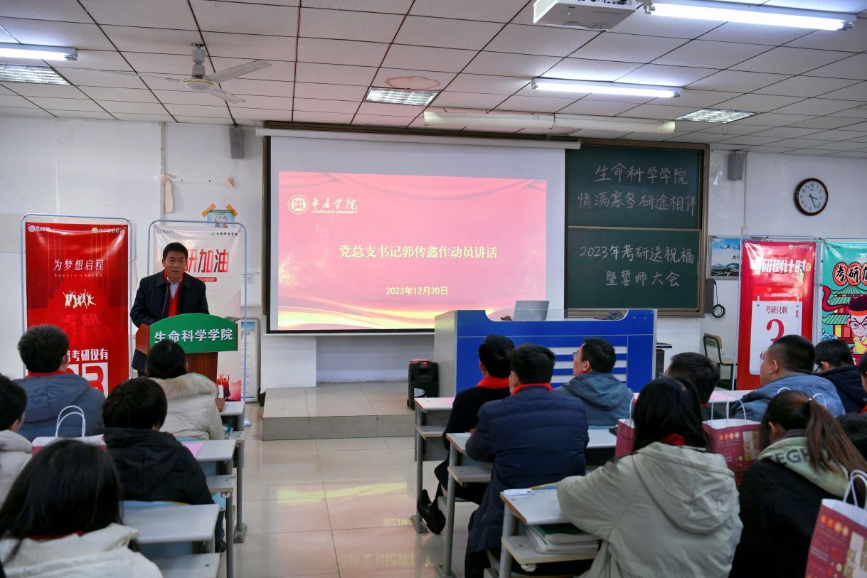 为帮助考研学子坚定备考信心,鼓舞考研士气,传递温暖和力量,12月20日下午,生命科学学院在理工楼2205教室举办“情暖寒冬,研途相伴”2023年考研送祝福暨誓师大会。学院党政领导、辅导员班主任、全体指导教师、优秀校友代表、2020级全体考研学子和部分其他年级代表参加大会。