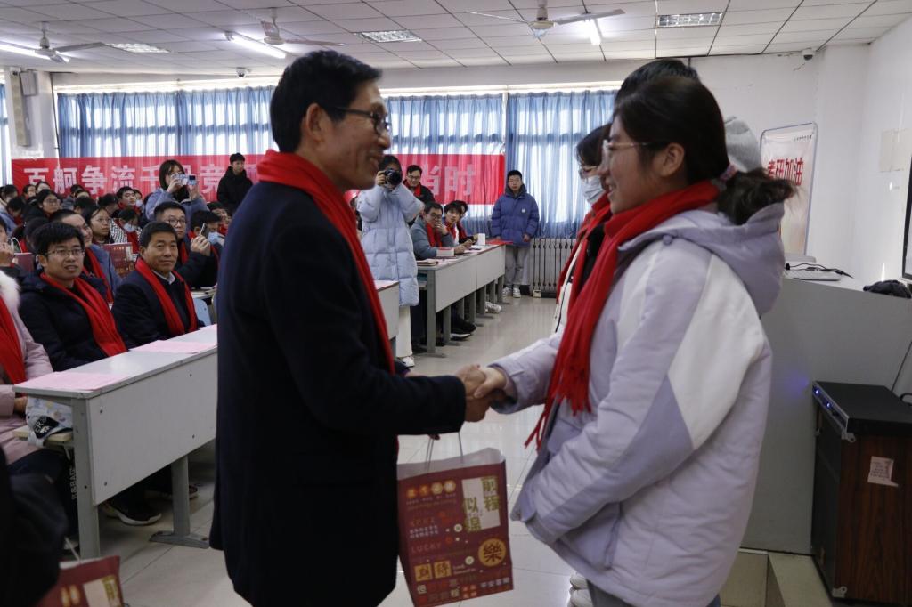 学院领导老师为考研学生分发考研“暖心加油大礼包”。现场气氛热烈而温馨,“薯”你最行、数你最“棒”、“包”你上岸、心想事“橙”……一件件充满寓意和希望的小礼品,一句句坚定温暖的祝福话语,为他们送去了冬日里的温暖关怀。全体考研学子进行宣誓,大家紧握右拳,以青春的名义郑重宣誓,坚守心中信念,全力以赴勇往无前。