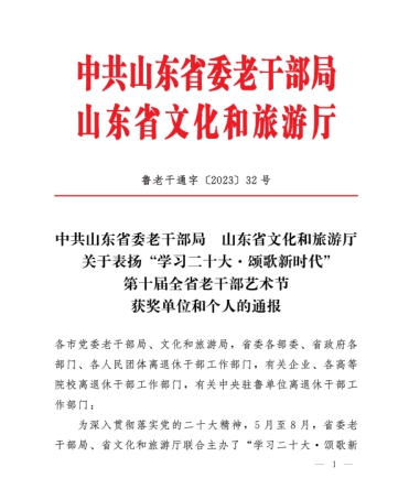 为深入贯彻落实党的二十大精神,5月至8月,省委老干部局、省文化和旅游厅联合主办了“学习二十大·颂歌新时代”第十届全省老干部艺术节,我校获得集体银奖和组织奖。